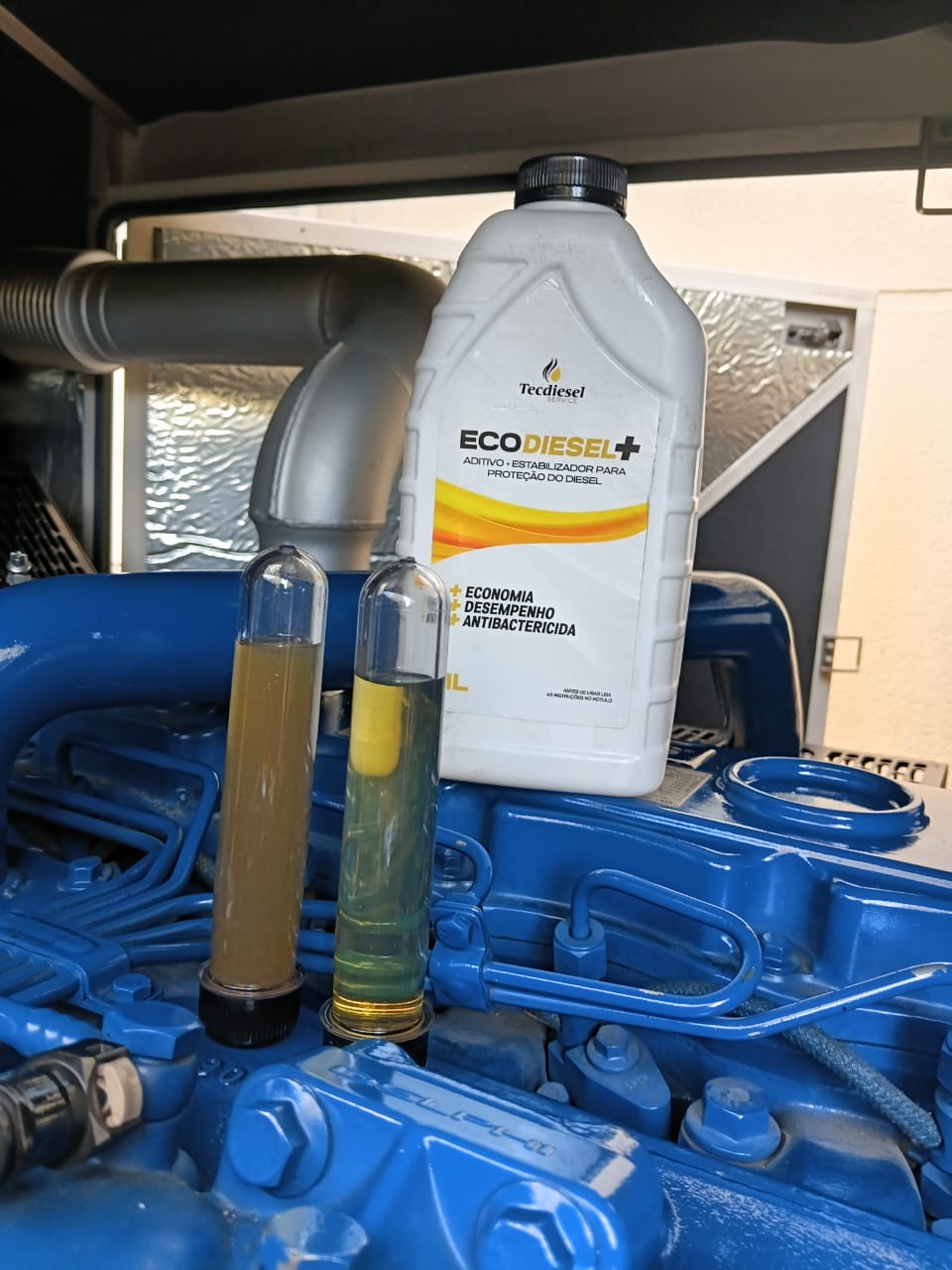 Foto comparativa de antes e depois de uma limpeza de tanque de um gerador. Pode-se observar a degradação do diesel seguido de fungos e bactérias. Após a limpeza o tanque ficou totalmente limpo e apto para uso.