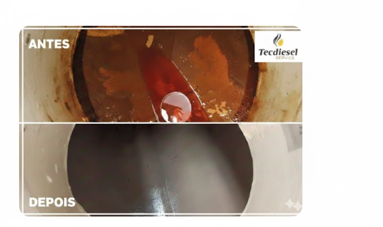Foto comparativa de antes e depois de uma limpeza de tanque de um gerador. Pode-se observar a degradação do diesel seguido de fungos e bactérias. Após a limpeza o tanque ficou totalmente limpo e apto para uso.